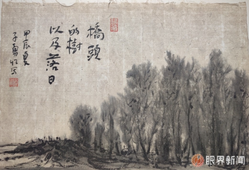韓子勇中國畫作品《橋頭的樹及落日》。記者趙劍塵 攝