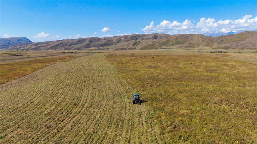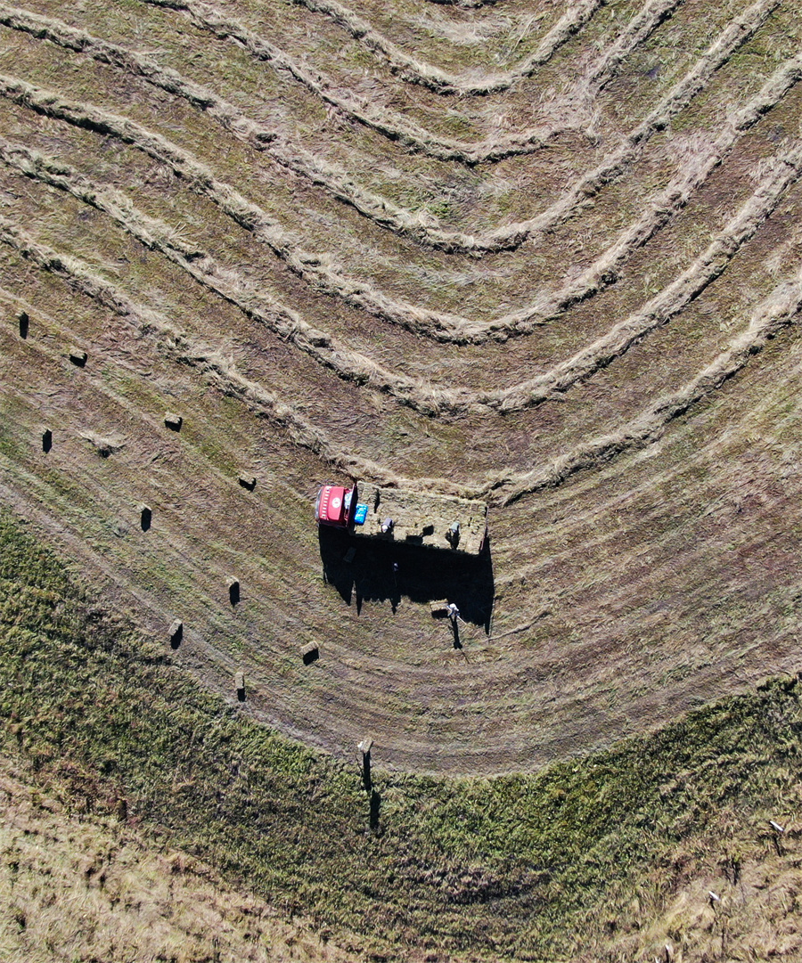 走進阿吾讚夏牧場,空氣中滿是青草的清新氣息。伴隨陣陣機械轟鳴聲,一台&現代化打草機械正在緊張作業。高空俯瞰,機械作業有如畫家的畫筆,在草原上畫出深淺交錯的紋路,一捆捆方形的牧草猶如散落在草原上“畫作”裏最鮮明的點綴。這一切把盛夏草原的生機,釀成可收藏的豐收底色。