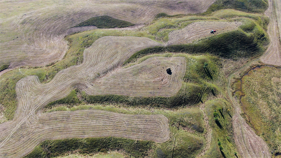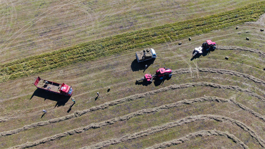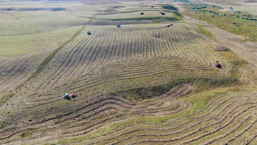 8月26日,各類機械相互配合,進行牧草收割作業。