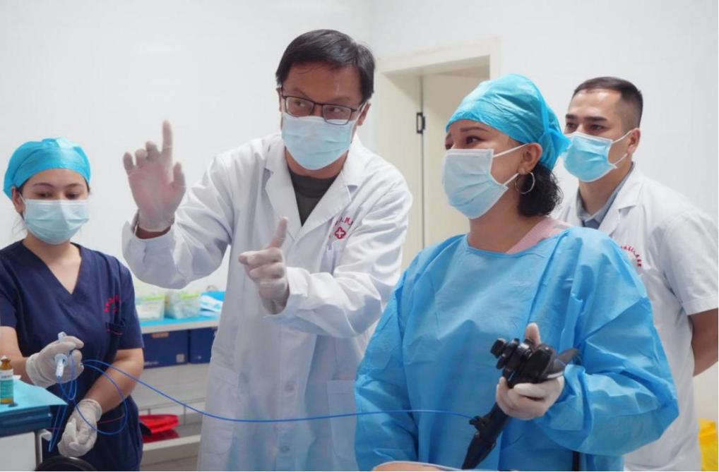 在內鏡室,消化內科主任醫師李明陽指導當地醫生演示內鏡下超級微創的治療理念,他一邊操作器械講解要點,一邊耐心回答問題。結束後,縣人民醫院消化內科主任買爾哈巴·卡瑪力為李明陽戴上承載着當地獨特文化底蘊、印有艾德萊斯花紋的圍巾和帽子。這份融入淳樸心意的特殊禮物,見證着不同地域醫療工作者因共同守護健康而結下的深厚情誼。
