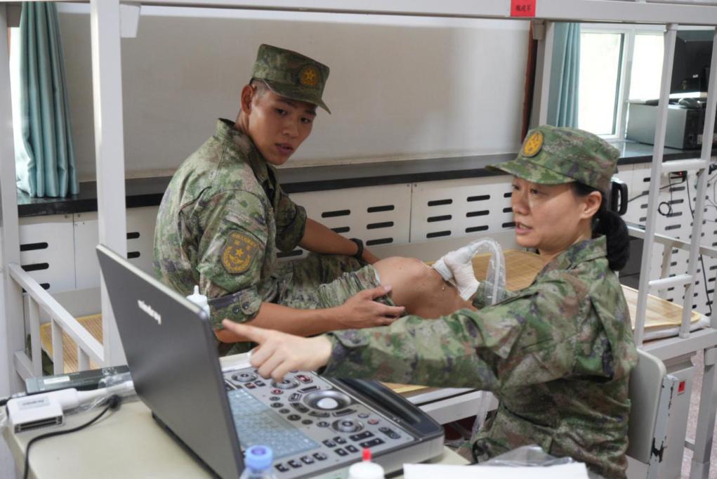 訓練場館裏,戰士小李詢問醫生:“我感覺脖子有點腫大,是不是有甲亢?”超聲診斷科副主任醫師蔣文莉用便攜式超聲診斷儀為其檢查甲狀腺,“別擔心,是良性的結節,下次體檢復查下甲功七項,如果有不正常指標,及時治療。”一旁不少戰士在中醫(針灸)科排起長隊,醫生李英一邊為訓練傷戰士針灸、拔罐,一邊叮囑:“肩關節損傷很常見,平時訓練要注意識別運動風險,調整強度,才能有效避免。”