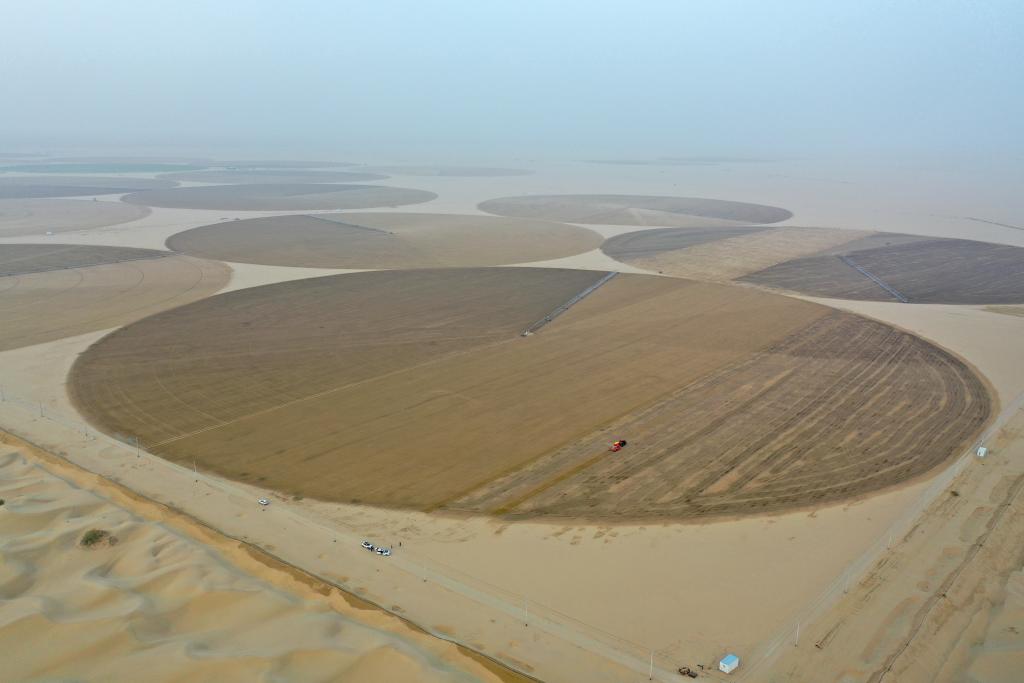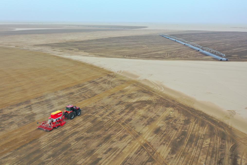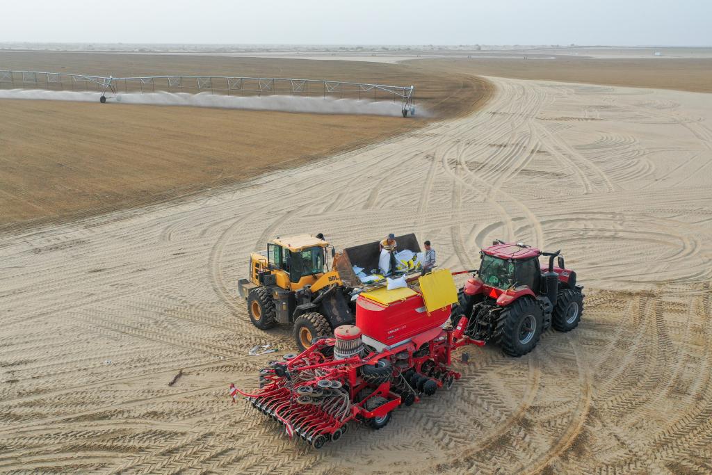 在新疆和田地區策勒縣4萬畝苜蓿種植基地,農機手駕駛機械在播種苜蓿(9月9日攝,無人機照片)。新華社記者 丁磊 攝