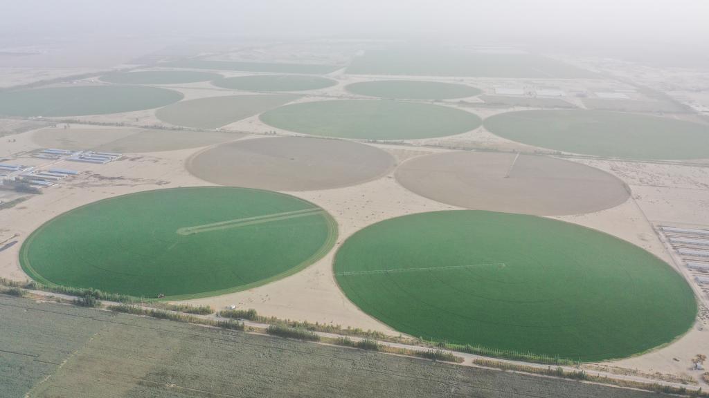 在新疆和田地區和田縣千畝苜蓿種植示範基地,指針式噴灌機進行淋灌作業(9月9日攝)。新華社記者 丁磊 攝