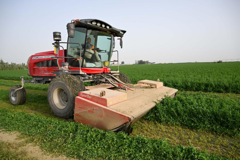 在新疆和田地區和田縣千畝苜蓿種植示範基地,農機手駕駛機械收割苜蓿(9月10日攝)。新華社記者 丁磊 攝