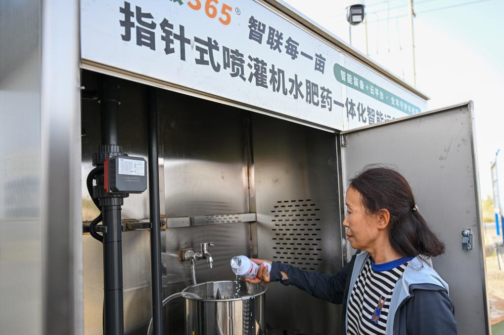 在新疆和田地區和田縣千畝苜蓿種植示範基地,技術人員在水肥藥一體化智能遠程管控終端配製農藥(9月10日攝)。新華社記者 丁磊 攝