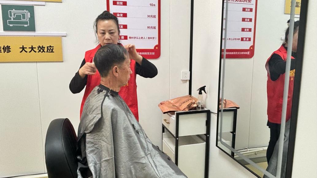 新疆昌吉市糧泰小區黨群服務驛站志願者在為居民理髮。