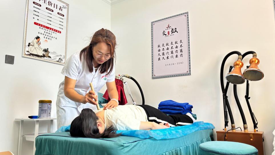 新疆昌吉市六工鎮十三戶村艾草體驗館工作人員王海霞為居民理療。