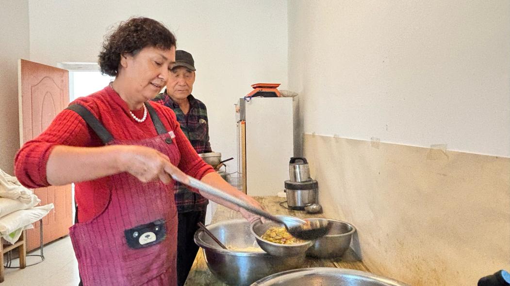 新疆昌吉市六工鎮十三戶村幸福互助院志願者在為老人盛飯。