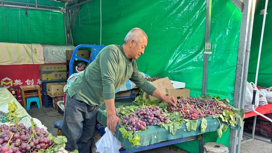 北京南路街道毛紡廠社區虹織鄰里集市愛心攤位攤主蘆勝傑在整理攤位。