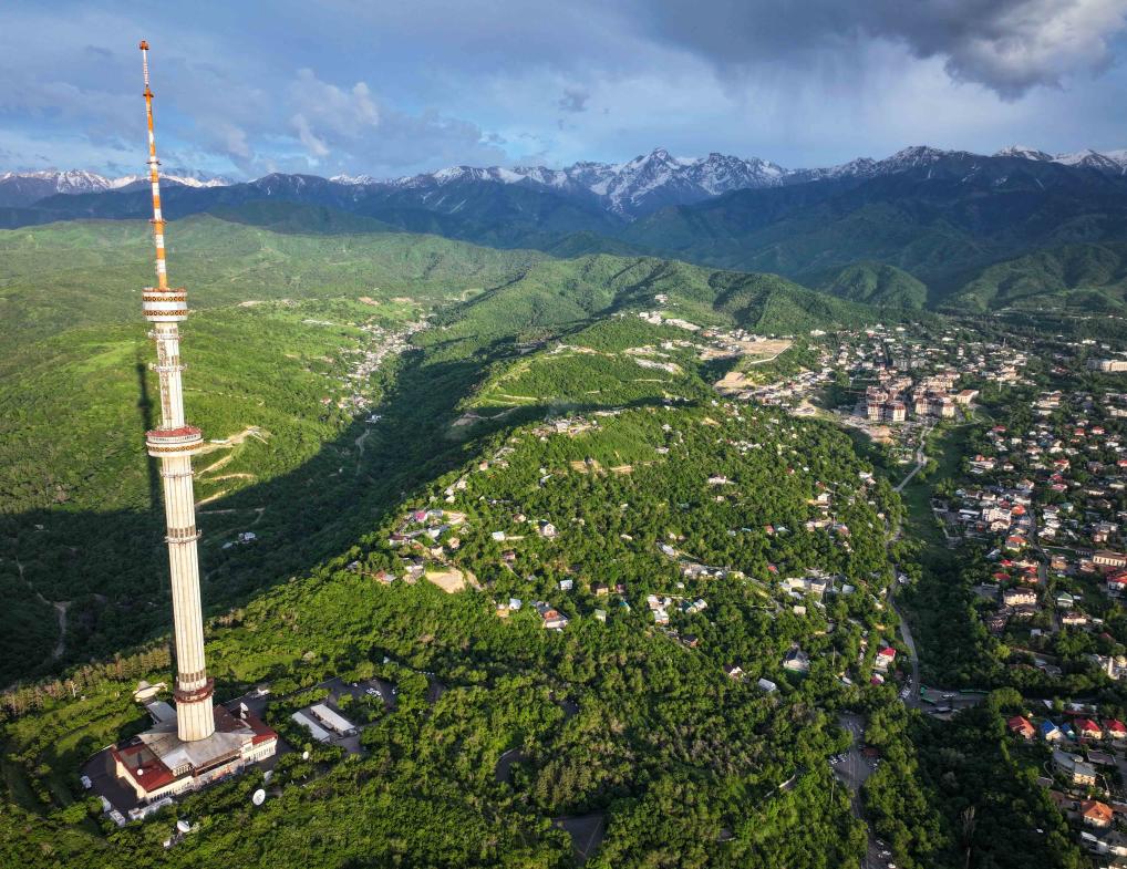 這是5月13日在哈薩克斯坦阿拉木圖拍攝的科克托別山和科克托別電視塔(無人機照片)。