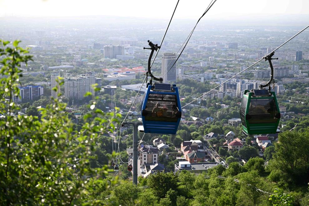5月13日,游客在哈薩克斯坦阿拉木圖的科克托別山乘坐纜車。