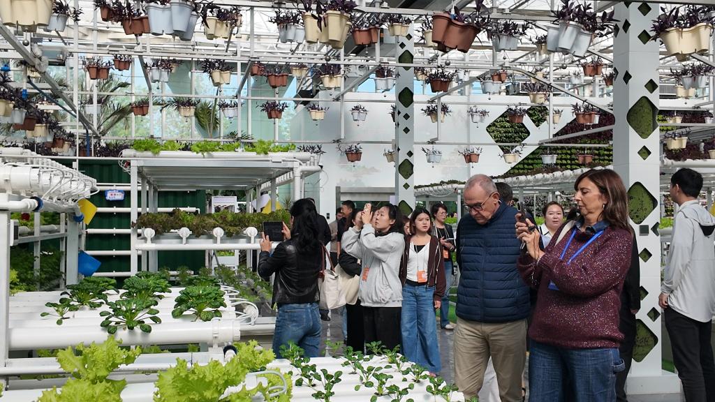走進昌吉新疆農業博覽園內的垂直農業展示區、葉菜工廠示範區和果菜工廠示範區,目睹無土栽培、無人機灌溉、光合作用智能調控等一系列農業高科技應用為作物“量身定制”生長環境,參訪議員們紛紛拍照記錄。