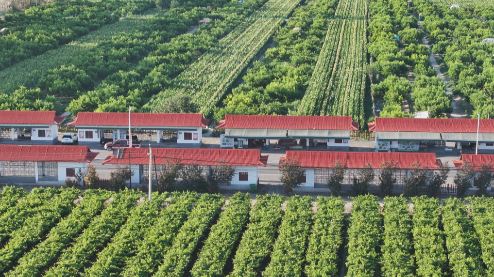 新疆生産建設兵團第八師石河子市一四三團九連,桃園綠意盎然,頭戴草帽的果農在林蔭下忙活。