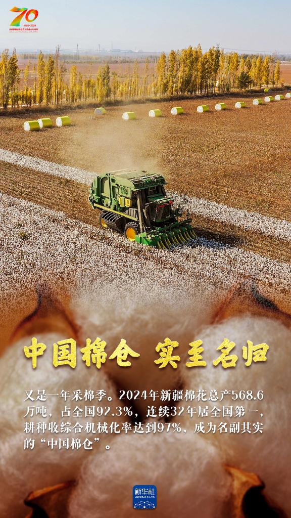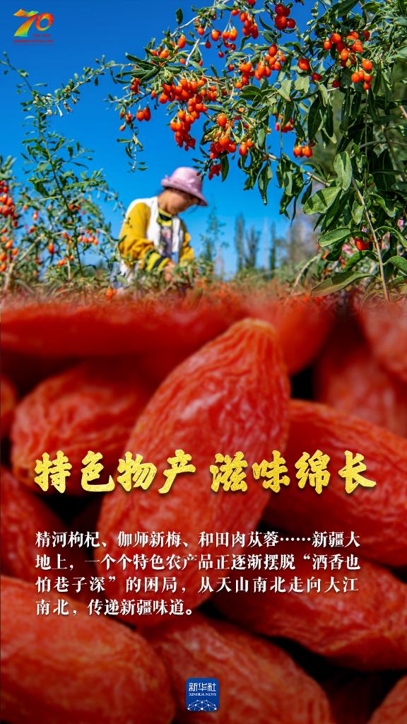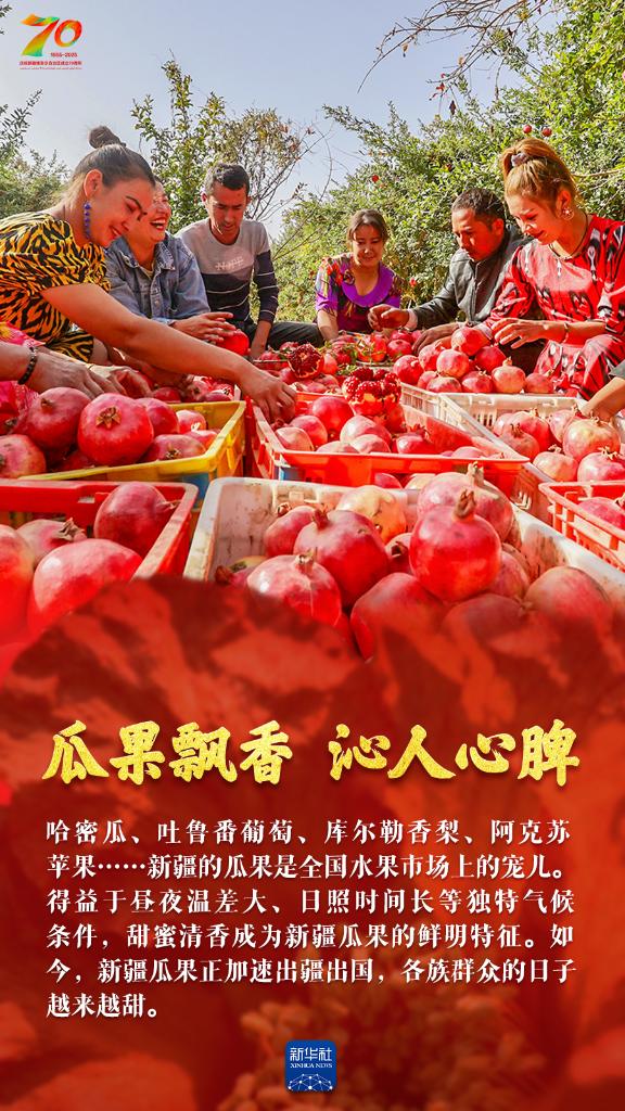 正是豐收好光景,天山南北倉廩實。今年是新疆維吾爾自治區成立70周年,70年來新疆農業生産發生了翻天覆地的變化:人均口糧從不足200公斤到糧食單産躍居全國第一;棉花佔全國總産量的比重超過九成;離海最遠的新疆成為多種海鮮出口地;皮亞曼的石榴、吐魯番的葡萄、庫爾勒的香梨、阿克蘇的蘋果……更是甜醉了全國人民的味蕾。讓我們跟隨這組海報,領略豐收裏的大美新疆。