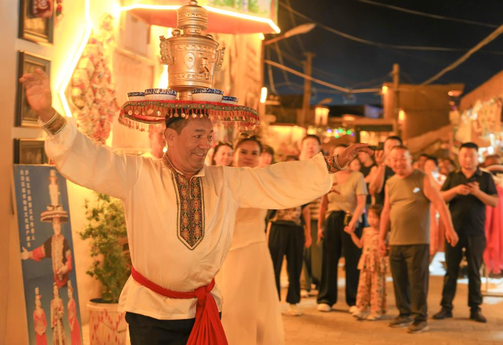 夜幕降臨,煙火氣息在庫車老城瀰漫。廣場上傳來歡快的樂曲聲,舞者頭頂銅盤銅壺,腳步輕快,將迎賓之禮——薩瑪瓦爾舞展現在游客面前,掌聲與歡笑聲此起彼伏。