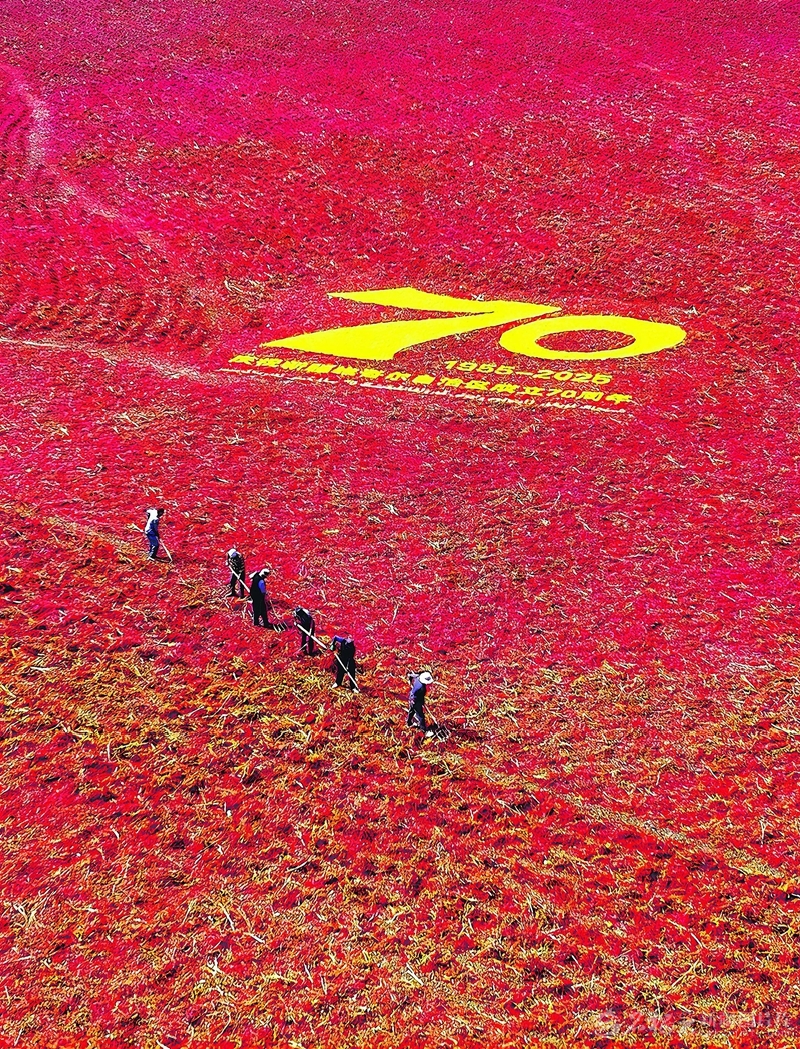 9月23日,沙灣市安集海鎮幹部群眾用農作物擺出慶祝新疆維吾爾自治區成立70周年祝福字樣,在豐收的喜慶氛圍中送上最誠摯的祝福。孫志坤 攝