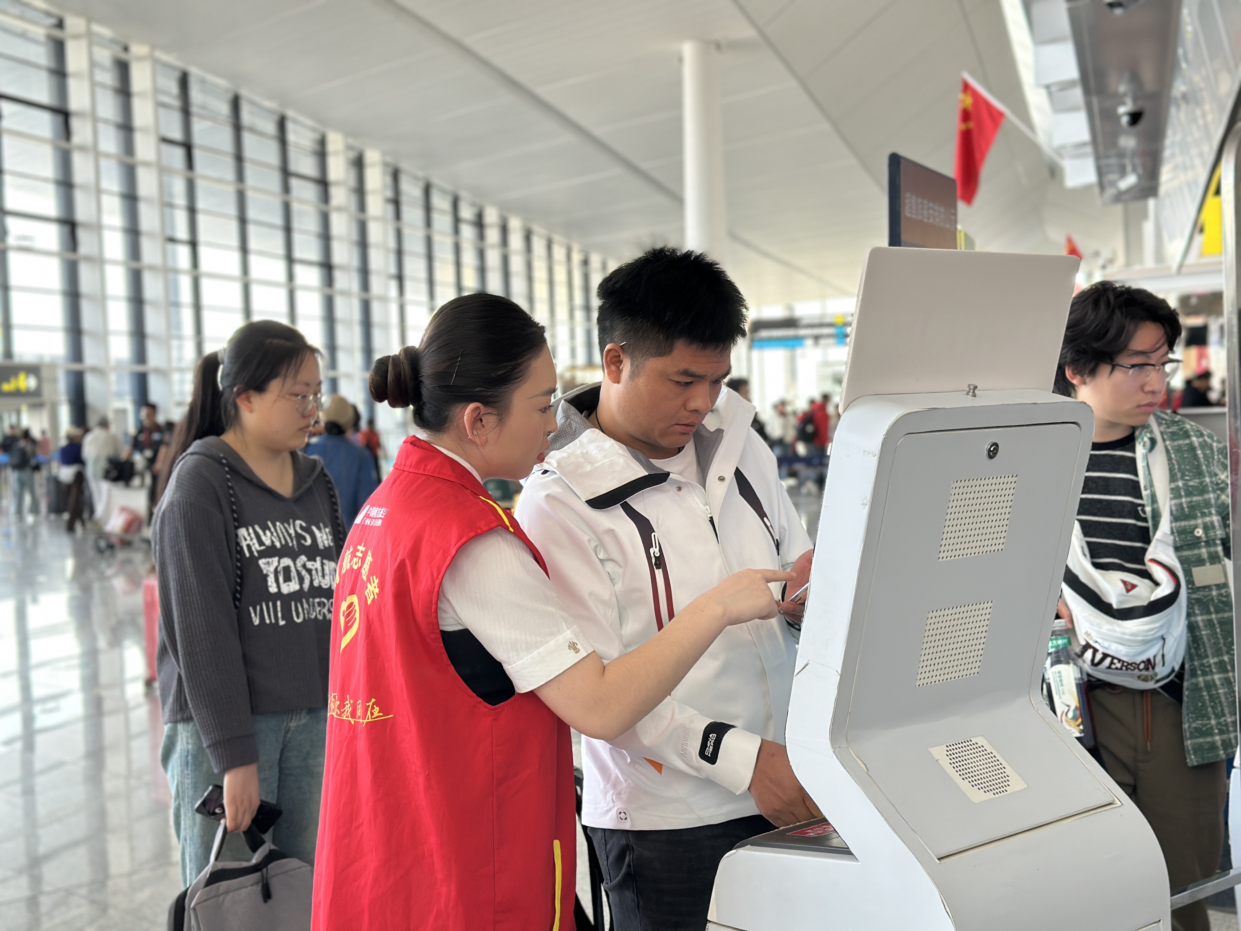 隨着旅客陸續抵達,登機口前逐漸熱鬧。自助閘機與人工通道同步開啟,高效應對當日早高峰超7000人次的客流。趙濤一邊維持秩序,提醒旅客提前準備登機憑證,一邊主動協助老年旅客、攜帶行李較多的旅客掃碼登機。短短半小時,她便保障近200名旅客順利登機。“我們不在機坪搬行李,也不在櫃&&登機牌,但我們是旅客登機前的最後一道守護。”趙濤擦了擦額角汗珠,笑着説,“能讓他們順利啟程,開啟愉快國慶假期,就是我們獻給國慶最好的禮物。”