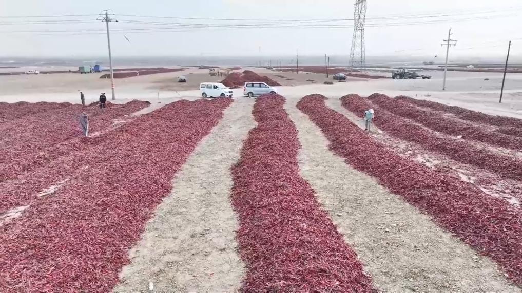 眼下,新疆巴音郭楞蒙古自治州和碩縣的19萬多畝色素辣椒進入晾曬季,一塊塊、一壟壟色素辣椒仿佛給戈壁灘披上了一張“紅毯”。