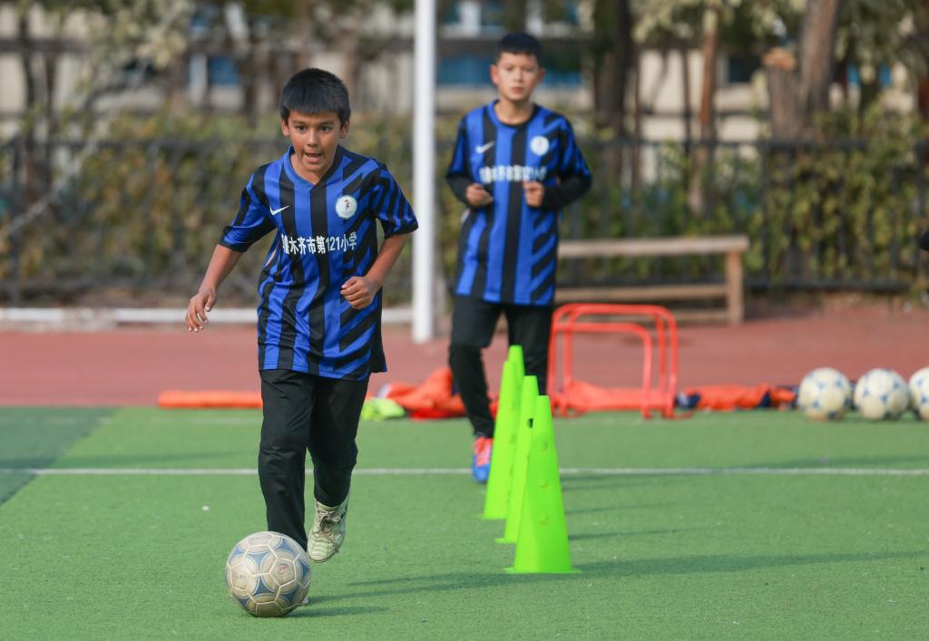 在眾多體育項目中,121小學選擇了足球。學校成立第二年,“小駿馬”校園足球隊就初具雛形。李磊説,選擇足球有兩點原因,一是長期以來,新疆各族群眾廣泛參與足球運動,氛圍濃厚,“大人小孩踢、大街小巷踢、一年四季踢,不少孩子打記事起就已愛上足球。”