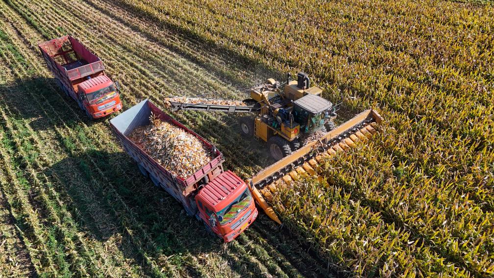 秋收時節,收割機轟隆隆駛過田野,拉運車車廂裏很快堆滿金黃的玉米粒。天山南北廣袤糧田裏,處處展現豐收圖景。