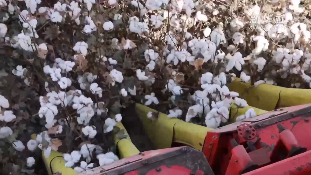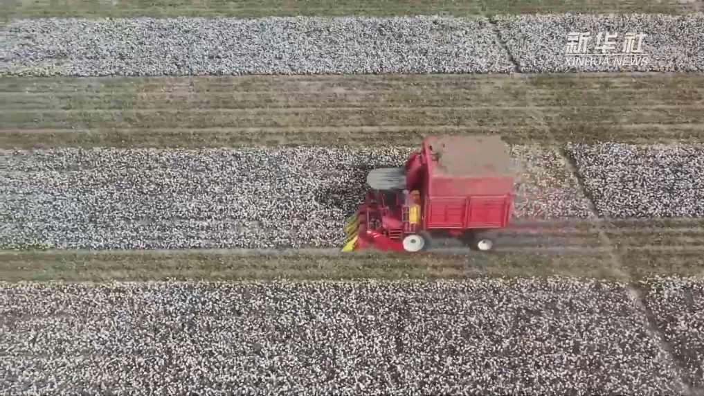 數&&型採棉機穿梭其間,朵朵棉花被採棉機採摘、收集、打包、出倉,棉田裏一派豐收繁忙景象。