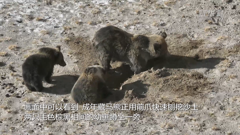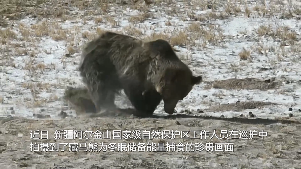 近日,新疆阿爾金山國家級自然保護區工作人員在巡護中,拍攝到了藏馬熊為冬眠儲備能量捕食的珍貴畫面。