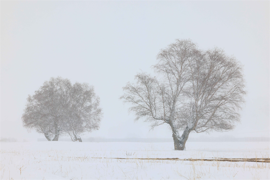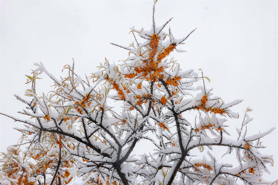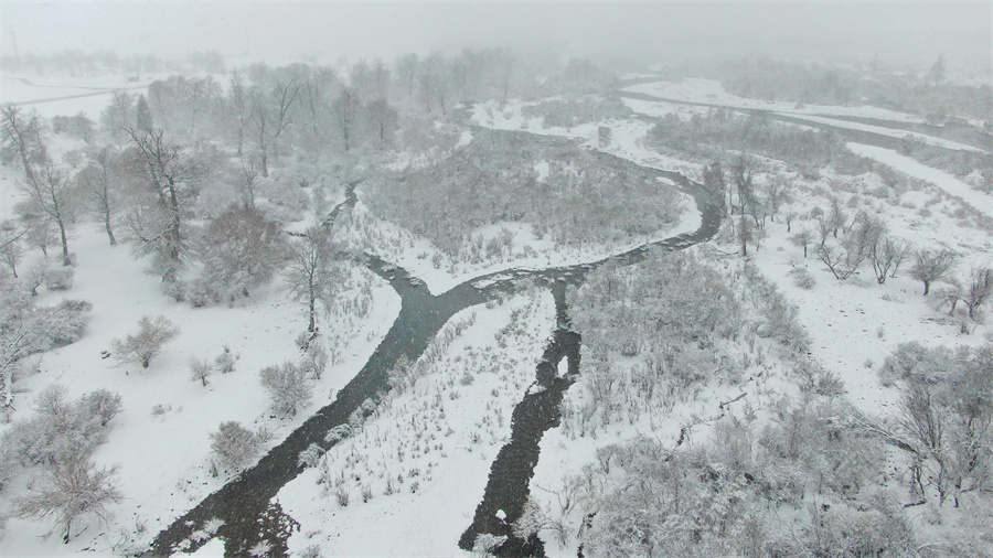河流在雪原中如墨帶蜿蜒穿梭,飛鳥靜立雪枝,沙棘樹的橙紅果實綴於琼枝間,與白雪相映。冬雪輕攏萬物,將草原的遼闊、森林的深邃、牧群的悠然編織成一幅靜謐卻不失生機的立冬圖景,每一處景致都流淌着“塞外江南”的冬日詩意。