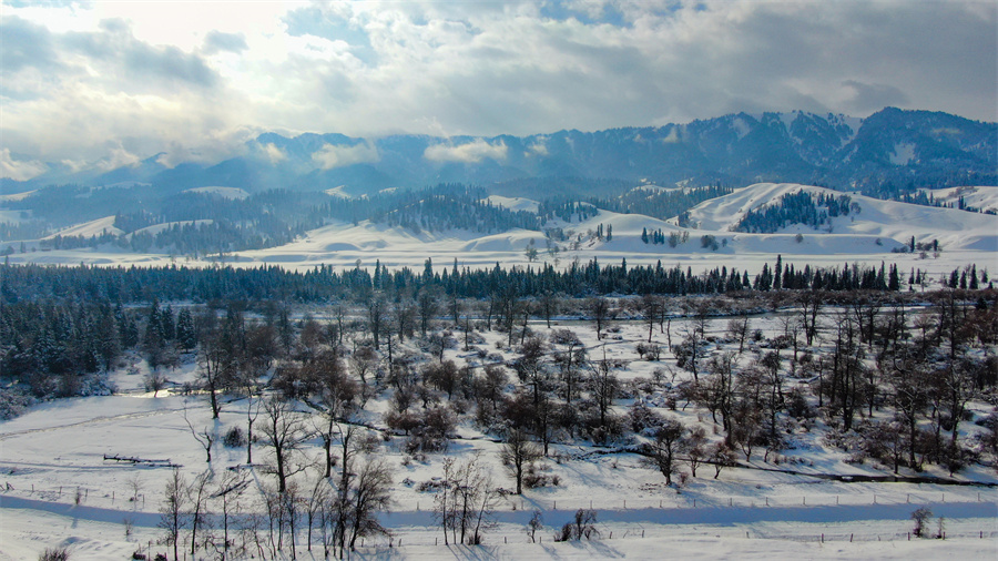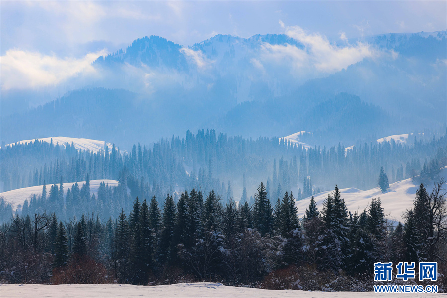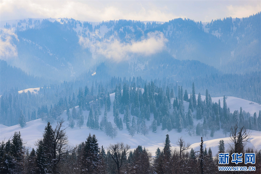 初冬時節,新疆新源縣那拉提褪去夏的蔥鬱與秋的絢爛,一場場瑞雪灑落山間,將大地裝點成銀裝素裹的冰雪世界,勾勒出一幅意境悠遠的水墨國畫。那拉提山間雲霧繚繞,起伏的山體在雲霧中若隱若現,遠山近景層次分明,墨色與白色相互交織,盡顯中式美學的空靈與靜謐。