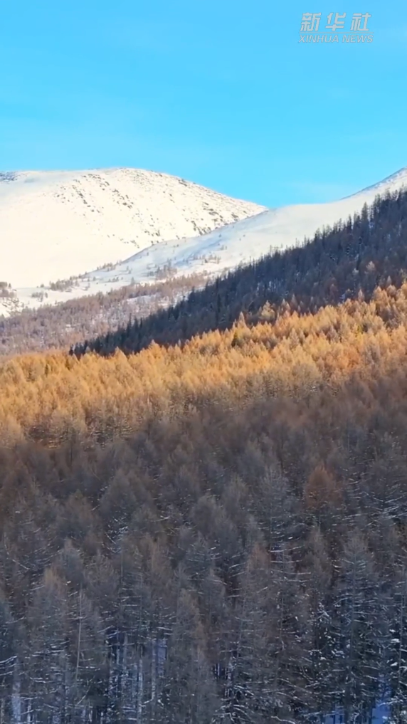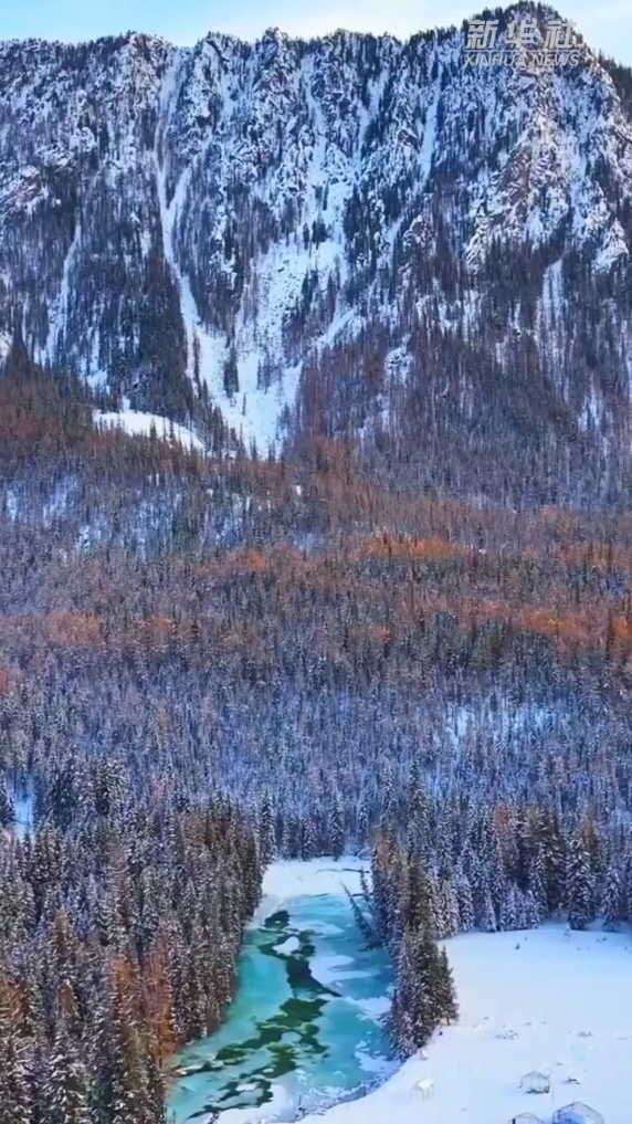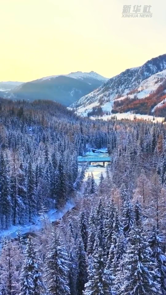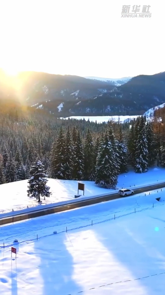 12月上旬的新疆阿勒泰阿禾公路鑲嵌在雪山之間,大河半冰半流,松杉覆雪如絨,晨光漫過山巔,將雪色染得清透。