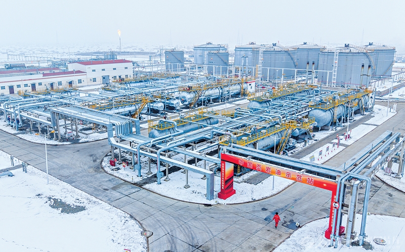 在吉木薩爾國家級陸相頁巖油示範區頁巖油聯合站,示範區開採出來的頁巖油集輸至此處理(攝於12月8日)。□張睿攝