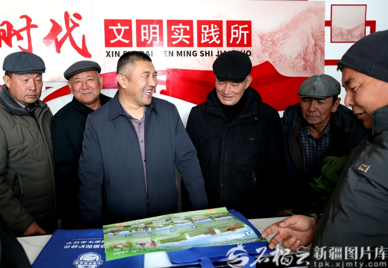 12月13日,在鞏留縣塔斯托別鄉,阿曼太·斯勒肯別克(左三)利用草原監測圖向牧民普及生態保護知識,引導牧民守護草原生態。
