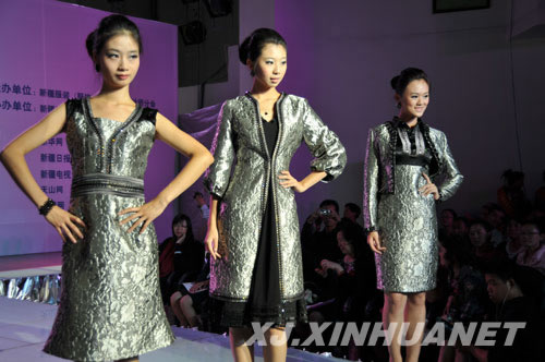 設計靈感來源於絲綢古道上現代人們時尚靚麗、自信勇敢,對和諧美好生活的憧憬。本設計作品運用帶有民族風情的高科技半浮雕面料,服裝局部採用具有新疆民族特色的腰果花圖形和艾德萊絲的適合紋樣組合,用高檔的管珠、水鑽、寶石進行鑲嵌工藝的處理。款式設計上貼近生活,加上細節上的輔助設計,使得本系列服裝在“民族中帶有優雅時尚,在時尚中又具有特別的民族風”。