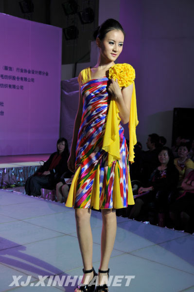 設計靈感來自於天空中美麗的彩虹,運用立體裁剪手法,不對稱的設計表現,將艾德萊斯斜向拼接,螺旋分割以及不同部位展開變褶,使變化更加豐富多樣,一層層的褶皺斜向交織排列,又宛如一道道亮麗的彩虹劃過天空,希望這道美麗的彩虹能飛出新疆、飛出中國、走向世界的時裝舞&。