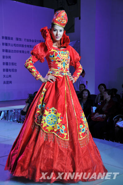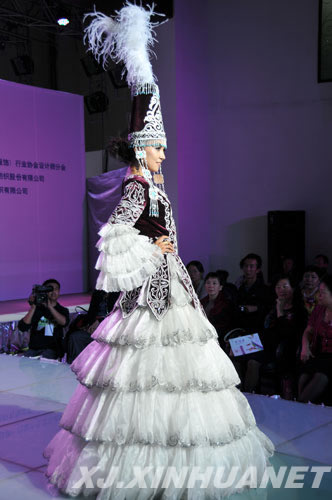 在今年亞歐博覽會上自治區婦聯在“靚麗工程”展廳中展示的13套民族盛裝,這是來自絲路霓裳服裝設計總監孫秀琴和她團隊設計的。
