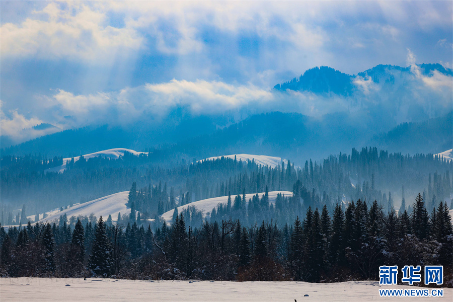 初冬時節,新疆新源縣那拉提褪去夏的蔥鬱與秋的絢爛,一場場瑞雪灑落山間,將大地裝點成銀裝素裹的冰雪世界,勾勒出一幅意境悠遠的水墨國畫。那拉提山間雲霧繚繞,起伏的山體在雲霧中若隱若現,遠山近景層次分明,墨色與白色相互交織,盡顯中式美學的空靈與靜謐。