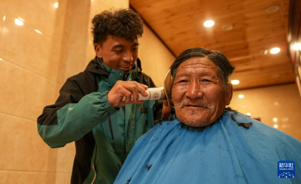 4月25日,那曲市色尼區老年人日間照料中心的工作人員為老人理髮。新華社記者 晉美多吉 攝