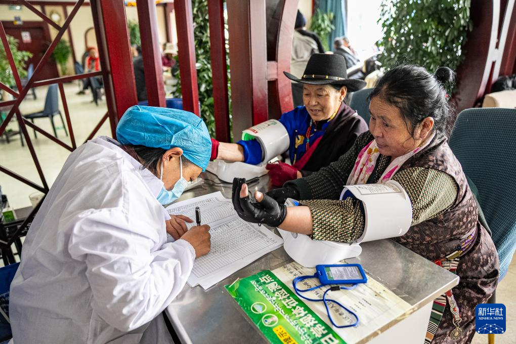 4月25日,在那曲市色尼區老年人日間照料中心,老人在測量血壓。新華社記者 丁增尼達 攝