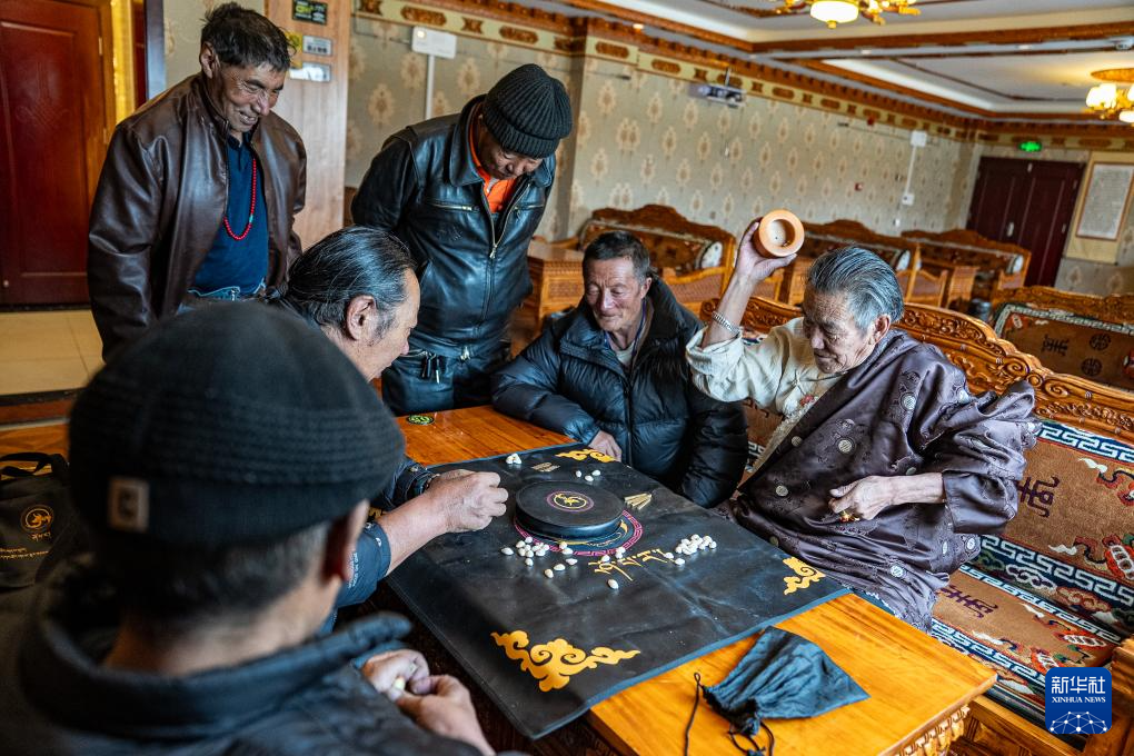 4月25日,老人們在那曲市色尼區老年人日間照料中心玩藏式骰子。新華社記者 丁增尼達 攝