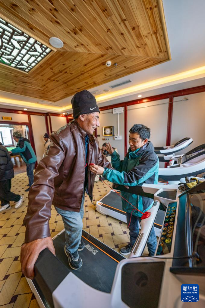 4月25日,在那曲市色尼區老年人日間照料中心,工作人員陪同老人在跑步機上做運動。新華社記者 丁增尼達 攝