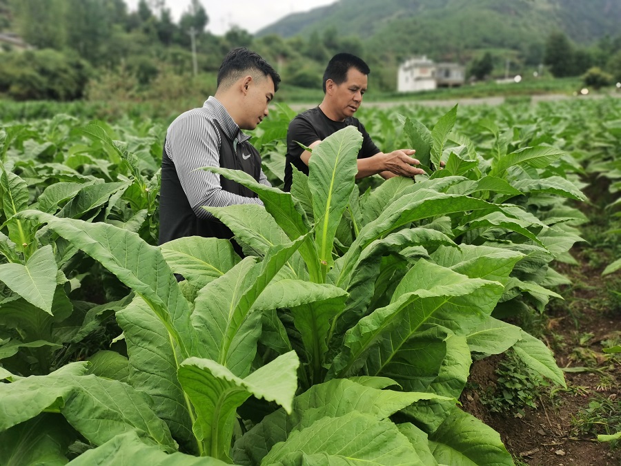 技術人員查看煙葉生長情況(資料圖)。洱源縣三營鎮煙站 供圖