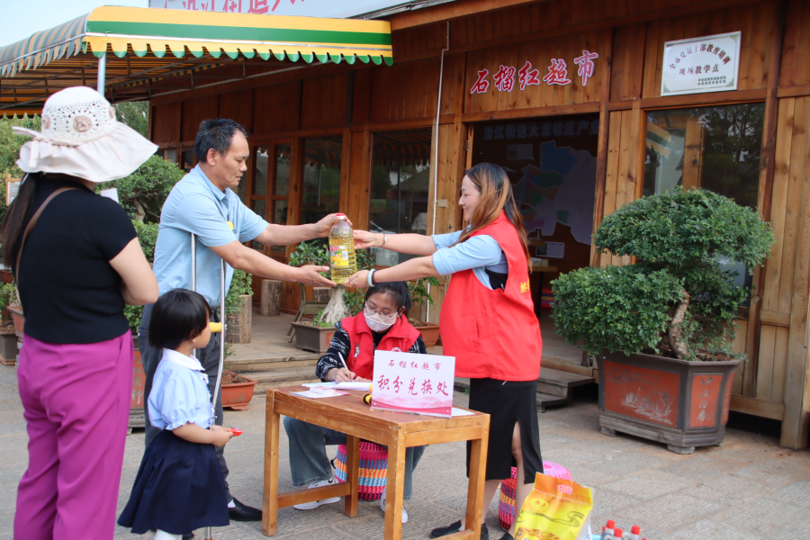 走進位於雲南省曲靖市麒麟區沿江街道大龍社區的“石榴紅超市”,環境乾淨整潔,各式商品一排排整齊地擺放在貨架上。不同的是商品下方的標價牌變成了“石榴籽”積分牌,一支鉛筆10個積分、一塊肥皂10個積分、一瓶醬油20個積分……