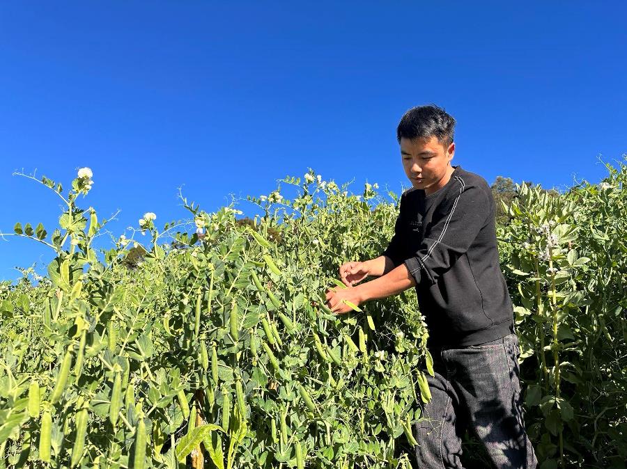 楊恒彪在自家田裏採摘豌豆(資料圖)。趙新梅 攝