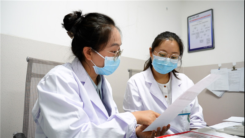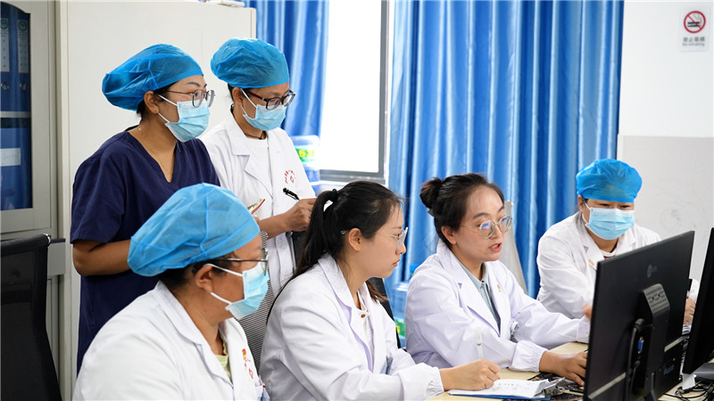 顏博(右二)在給科室同事分析病例(5月14日攝)。