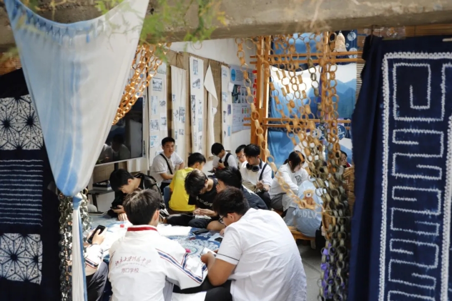 每一塊布料都承載着孩子們的創意與夢想,從畫刷圖案、絞扎、浸泡、染布,到蒸煮、曬乾、拆線、漂洗、碾布……