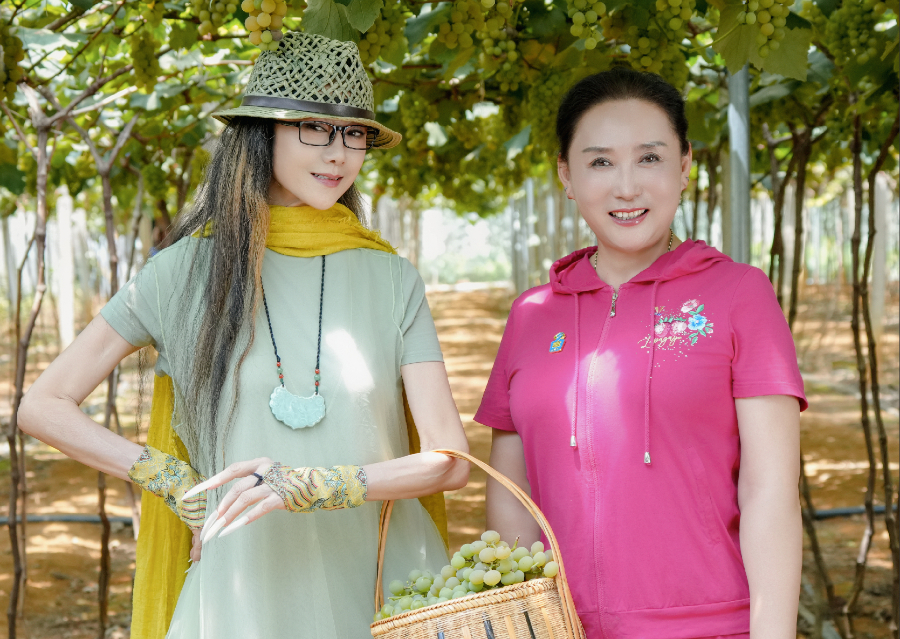 舞蹈藝術家楊麗萍與雲南印象酒業創始人申娜(右)在葡萄莊園合影(資料圖)。(雲南印象供圖)