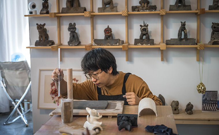揉陶築首,搓土成身。在昆明市古滇路轉角的“心房瓦貓博物館”內,張航伏案而坐,翻動着指尖刻刀,在陶土上勾勒出瓦貓誇張的神態。