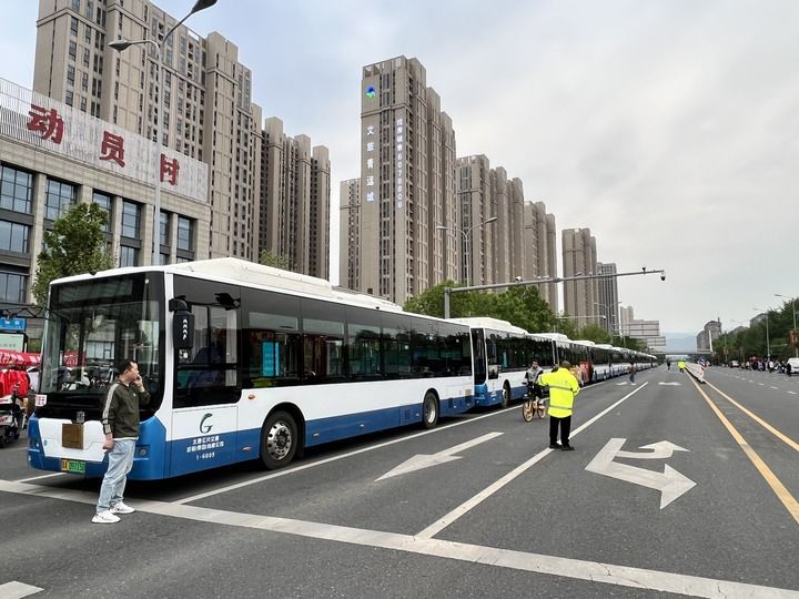“歌迷之城”太原演唱會場館門口整整齊齊停着兩排免費接駁車。(新華社記者張磊攝)