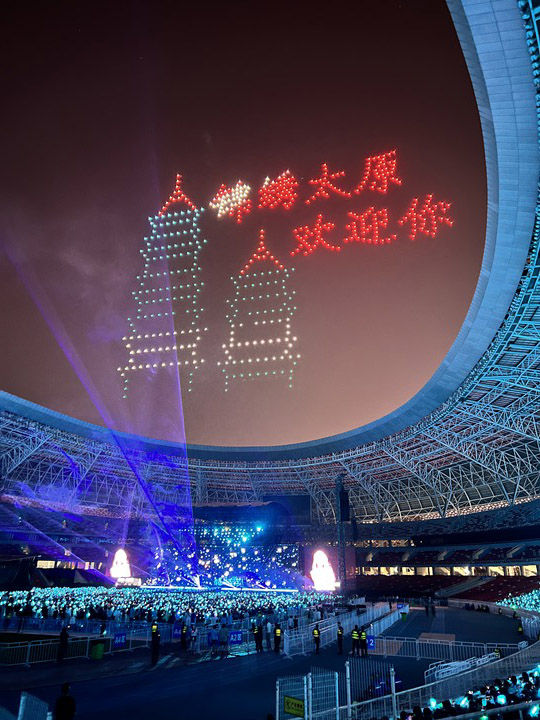 “歌迷之城”太原演唱會現場的無人機表演。(新華社記者張磊攝)