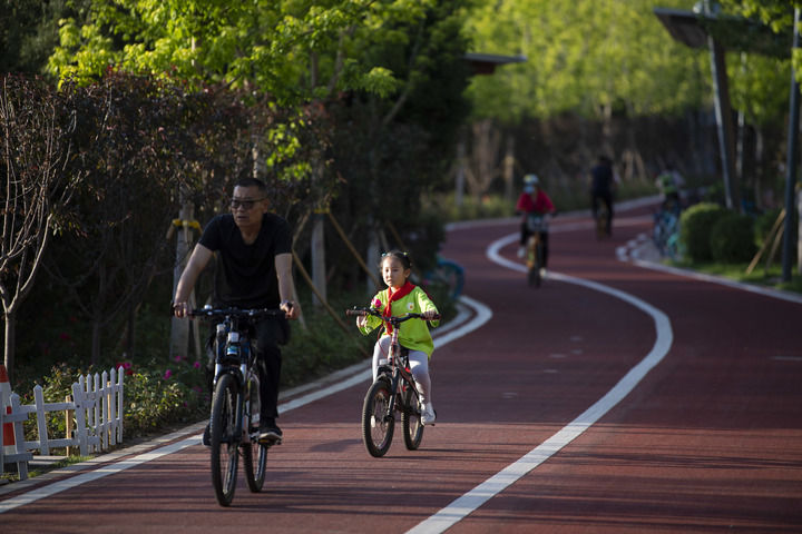 市民在太原濱河自行車道騎行(2021年5月28日攝)。