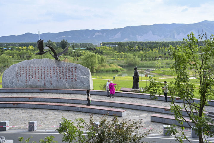 游客在位於山西太原汾河畔的雁丘園參觀(2024年6月3日攝)。